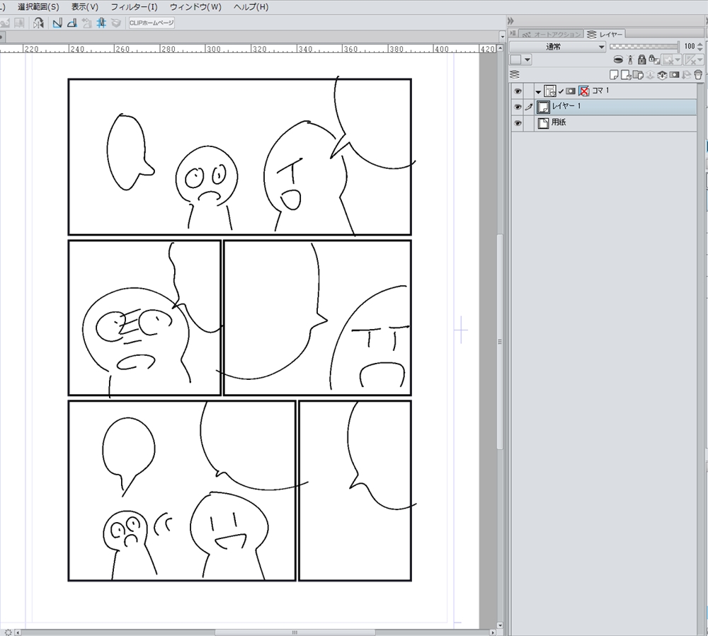 コマ割りです割ります。割る前に下書きレイヤー等でラフ描きしてからやってもいいと思いますし、