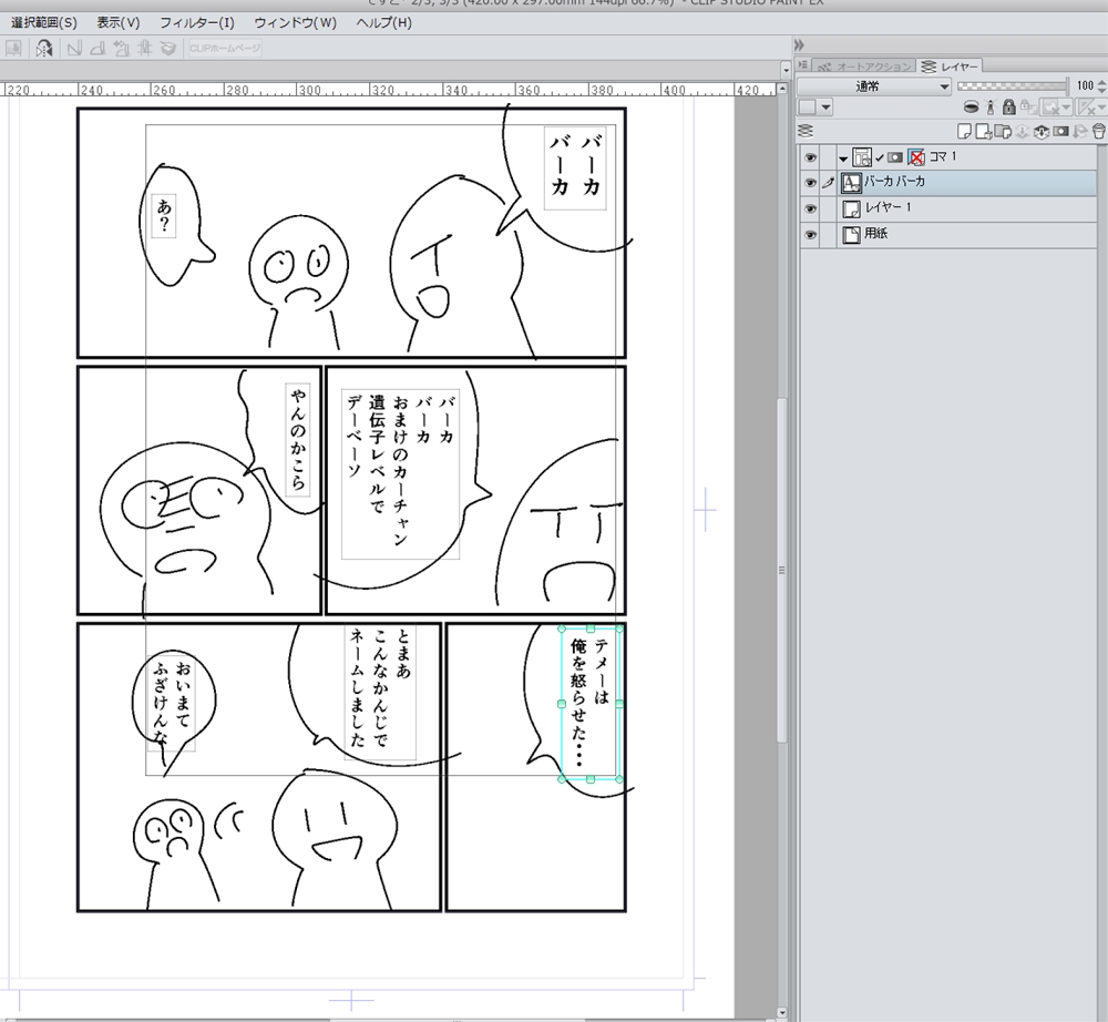 一個のレイヤーにまとまってたテキストレイヤーからセリフを各コマに切り貼りします。